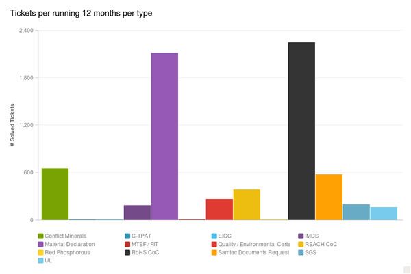 Samtec,Inc.全球合规总监Mark Bobo说:“由于缺乏方向,最终导致公司寻求不同的方法来解决这个问题。这些差异意味着缺乏效率和有效性,换而言之,提高了公司和客户的成本。”由于Samtec在130个国家开展业务,在七个国际地点设有工厂,因此它们的数据可以说明全世界的要求和优先事项。Bobo说,Samtec已经建立了广泛的在线自动响应能力,可回应每天超过5000个的询盘。最高需求是针对RoHS认证,其次是材料声明和冲突材料清单,如下所示: